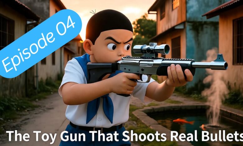News flew. Afternoon, Nobita ruled: swaps for sweets, prime desk spots, Shizuka even flashing smiles. “Brave move, Nobita,” she said, and his face heated worse than the pistol’s heat. Power’s tricky, though. Evening alley run, he pinged a can and clipped the neighbor’s fancy fish pond—koi bobbing dead, geezer storming the fence. “You brat! Those were my charm fish!” Nobita stuttered sorrys, but the harm lingered. Then Gian, ego bruised, jumped him at twilight with a slingshot primed. Nobita shot blind—round bouncing off a pole, smashing Mrs. Tanaka’s doll shelf to bits. Glass showered, yells rang, and boom—the “tough guy” was the bad guy in everyone’s crosshairs.